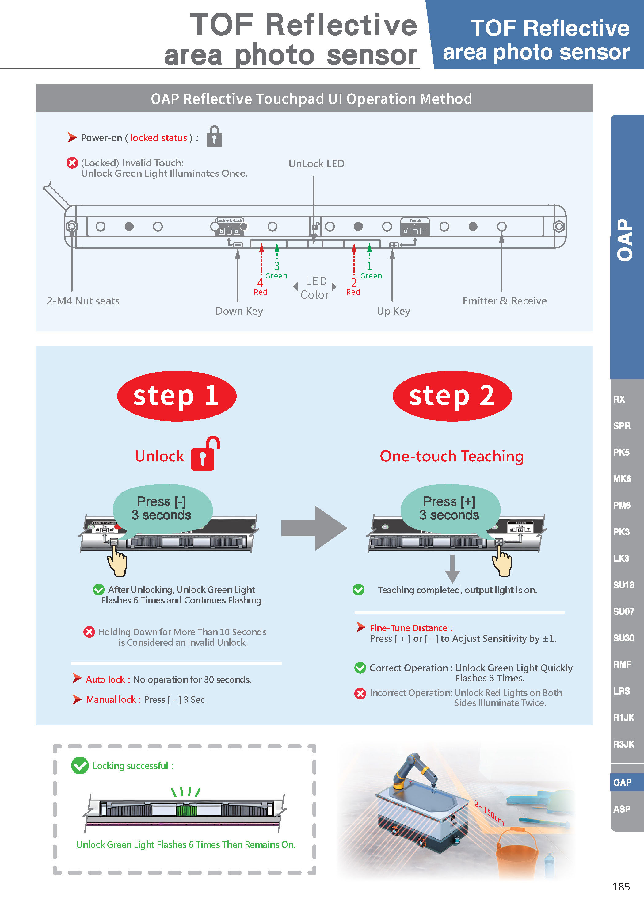 | 表示LED | 正常に通電されている状態で、LEDライトが送信側の光軸に反射される場合、赤と緑のライトが完全に点灯します。正常に戻った場合、つまり送信側の光軸が反射されない場合、LEDは緑のライトを点灯します。 |